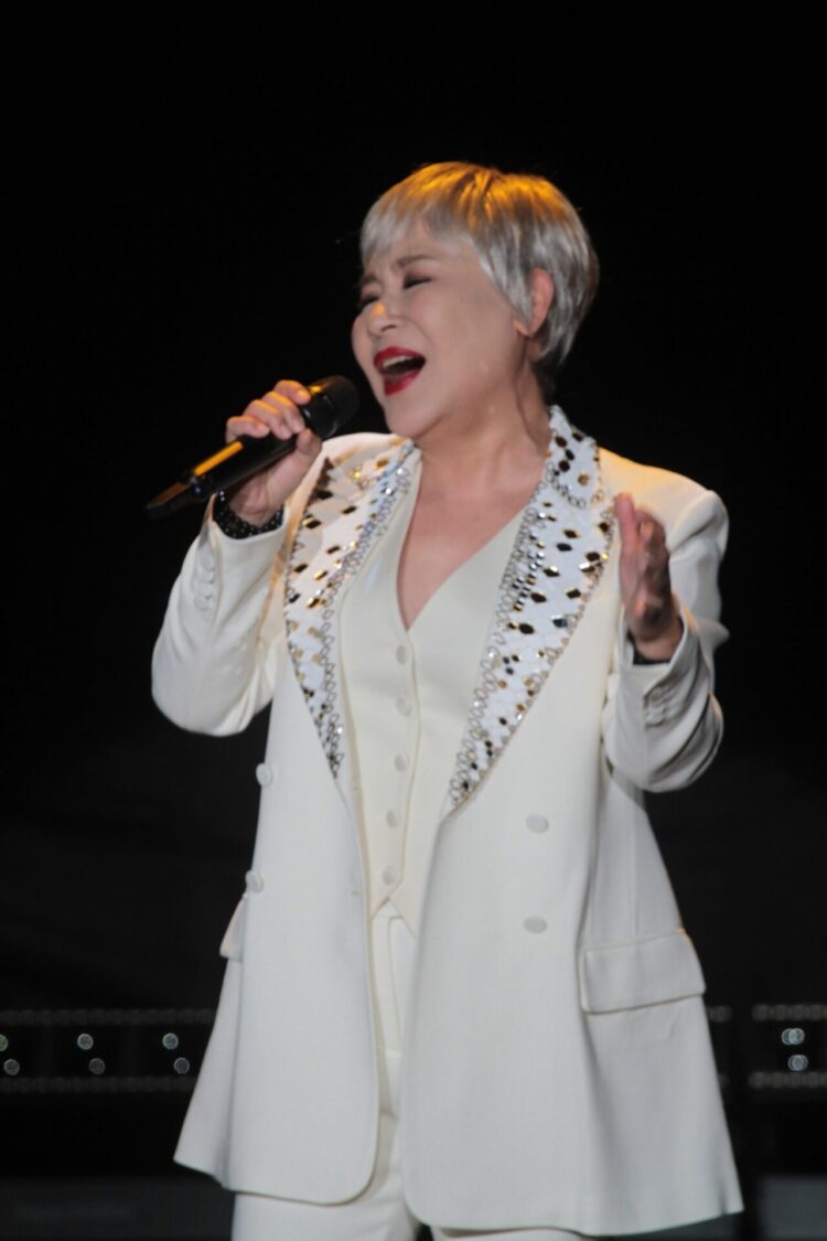 接著她娓娓唱出江蕙(二姐)的〈家後〉、江美麗〈暝那會這呢長〉、金佩珊〈一代女皇〉、庾澄慶〈熱情的沙漠〉、萬芳〈新不了情〉、蔡琴〈恰似你的溫柔〉、梅艷芳〈女人花〉與陳盈潔〈海海人生〉等經典名曲,無論溫柔抒情還是磅礡大器,她的嗓音都完美駕馭、情感直擊人心,全場沉醉如潮。