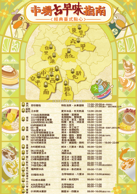 南市府表示,完整市場古早味指南資訊,可至「臺南市市場巡禮粉絲專頁」及「臺南市市場處官網」查詢。