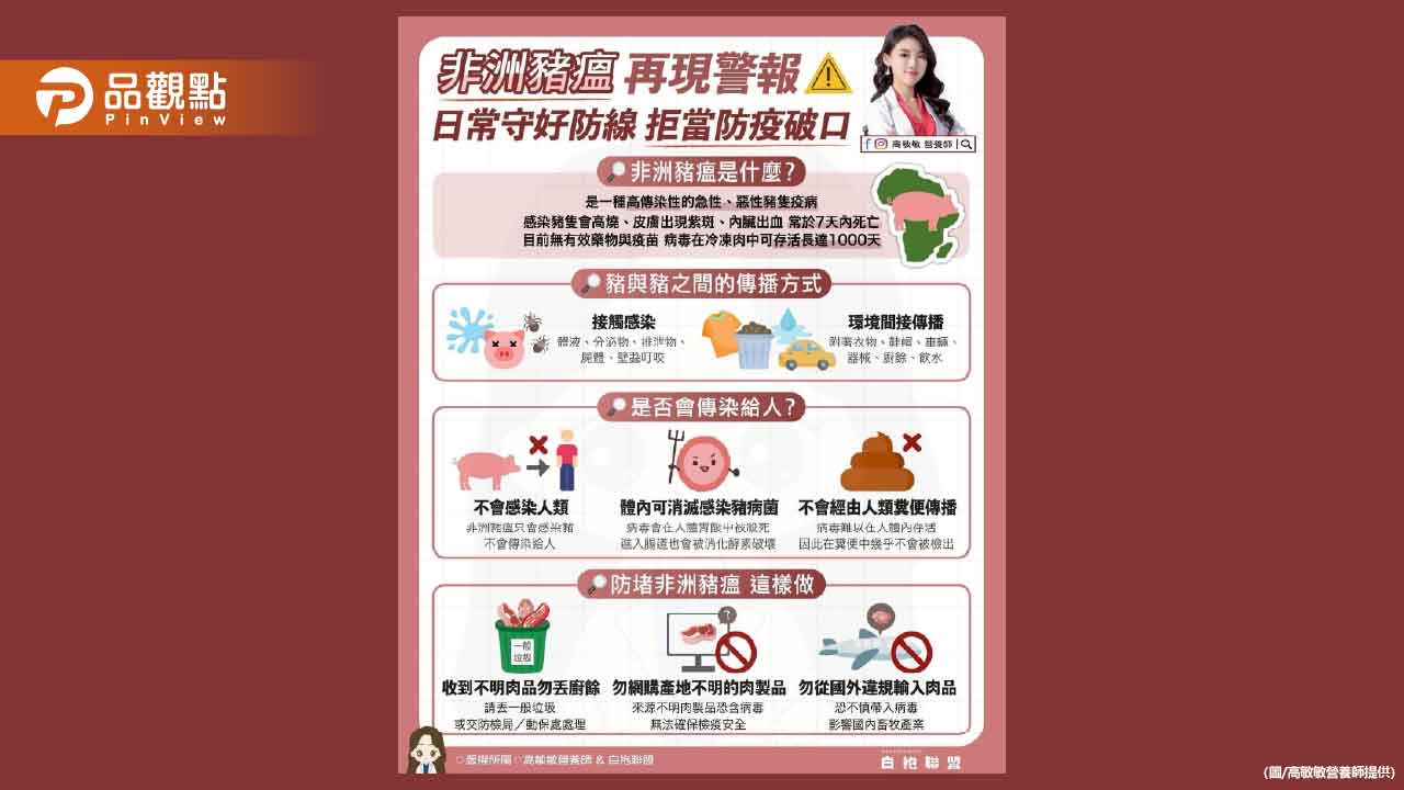 非洲豬瘟是什麼?是一種高傳染性的急性惡性豬隻疾病,感染後豬隻會高燒、皮膚出現紫斑、內臟出血,常在7天內死亡,目前沒有疫苗也無法治癒,病毒在冷凍肉中可存活超過1000天。