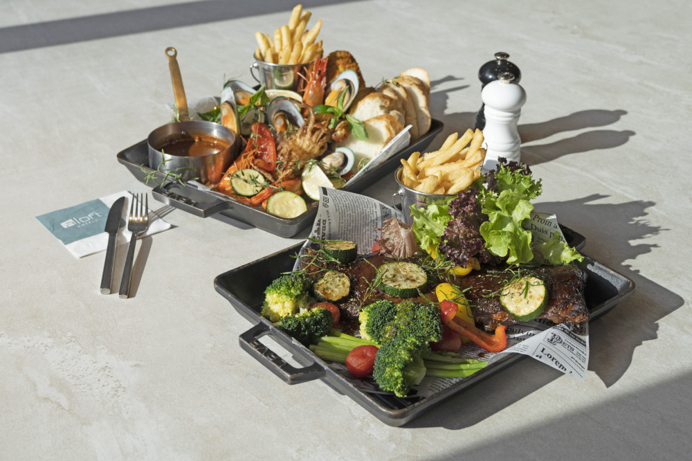 招牌「蒜炒海鮮拼盤」升級為「拿坡里惡魔醬烤海鮮」,售價1,280,含軟殼蟹、大蝦、「黑皮牌」龍膽石斑魚片等,搭配熬製2小時的「惡魔醬」;「樹子酸辣風味水煮石斑魚」售價1,280,以「Acqua Pazza」手法烹煮「黑皮牌」龍膽石斑,融合樹子酸辣味。所有餐飲另加 10% 服務費。