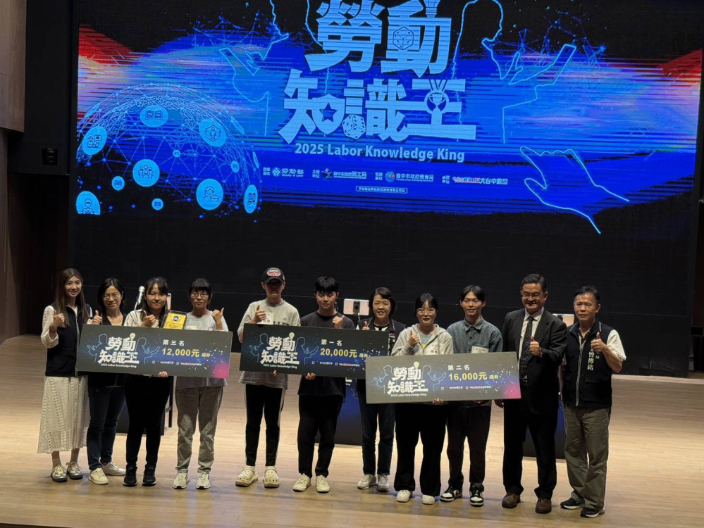 【 大成報記者蕭宇廷/臺中報導 】為啟發青年學子對勞動權益的認識,讓勞動法令知識向下扎根,台中市政府勞工局祭出超過15萬元獎勵、辦理「勞動知識王」,在10/25、10/26兩日激烈競爭下,最終由國中組「北勢國中」、高中職組「霧峰農工及台中一中」、大專院校組「亞洲大學」奪得冠軍,各組冠軍、亞軍及季軍各獲得2萬元、1萬6千元及1萬2千元禮券;此外,今年度「勞動之星」從91隊隊伍中脫穎而出,由大專組冠軍亞洲大學拿下!