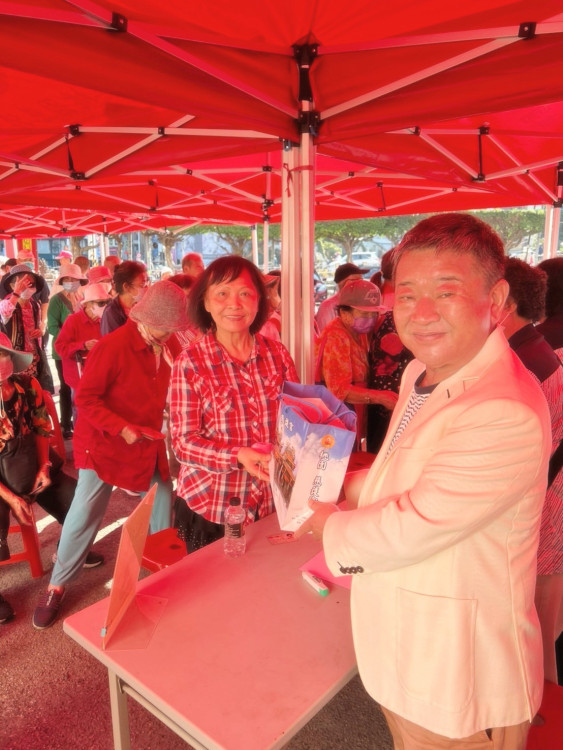 圖說: 桃園慈護宮主任委員簡征潭開心與信眾合照。( 圖/桃園慈護宮提供)