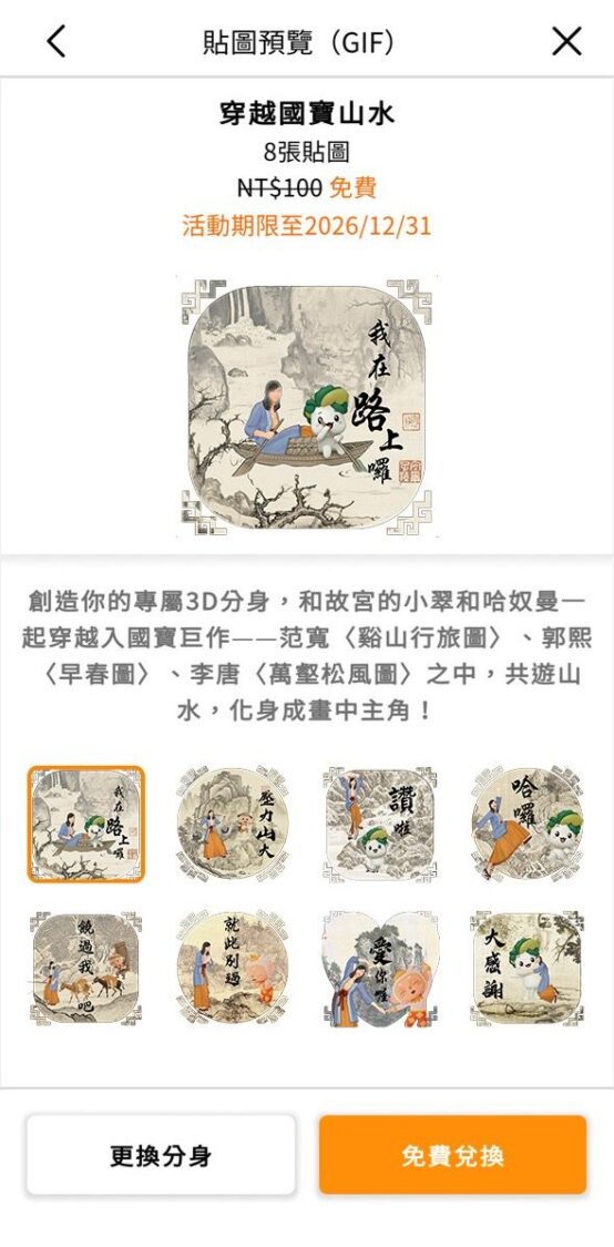 北宋三大家—范寬〈谿山行旅圖〉、郭熙〈早春圖〉、李唐〈萬壑松風圖〉的巨碑式山水,無疑是故宮書畫典藏的「鎮院國寶」,但遺憾的是當代人僅知梵谷而不知范寬,事實上范寬早在一千年前就使用高遠構圖,氣勢雄強;且畫中溪山深虛,水若有聲,這麼有意境的畫作若是能走進去看一看豈不更妙。為此故宮特別和台灣大哥大合作MyMoji 3D貼圖線上製作,只要掃瞄QR code就可穿越千年畫境,不但能體驗一把文青風格外,還可作為line的動態貼圖,有趣又實用,預計10月31日正式上線。