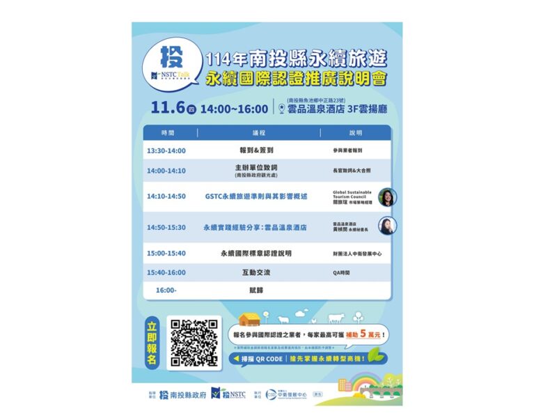推動南投縣觀光產業邁向永續發展,南投縣政府繼去年推動「南投永續觀光行動(NSTC)」,制定「南投永續觀光行動準則」後,進一步輔導業者強化永續國際認證相關認識與應用,將於11月6日假雲品溫泉酒店3樓雲揚廳舉辦「114年南投縣永續旅遊-永續國際認證推廣說明會」,協助南投觀光業者接軌國際永續潮流,即日起開放線上報名。