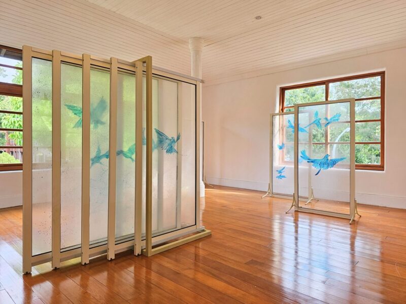 此外,南嶼詩社展現春天的〈複色光〉,由多彩圓片與藤蔓構成,蝴蝶在牆面與光影間穿梭,形成柔和明朗的春日印象;〈光閘〉懸掛著綠色壓克力方塊與藍染布,彷彿夏日的明亮閃光,青翠的植物則是躍動的生命在狂放;〈菲林〉以落葉與手寫詩句記錄秋天的私語;〈失焦〉利用原有的空間屬性,以霧面塑膠與棉絮等媒材,來模擬不斷漫出浴缸的水珠或泡沬,再現冬日時常蔓延而出的蕭寂情緒。《縮時顯影》展覽不僅讓觀眾「看見詩」,更能「走進詩」,感受時間、情緒與自然的交織及共鳴。