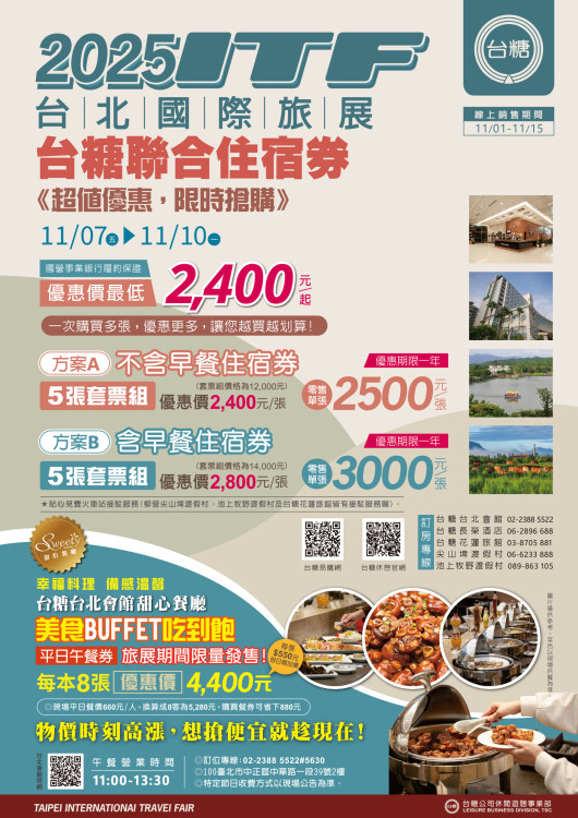 另尖山埤渡假村配合ITF台北國際旅展,自114年11月1日至11月15日於官網舉辦線上旅展,推出台糖聯合住宿券年度最低價每張只要2,500元起(不含早餐,優惠期限1年),購買一套5張還有優惠價,邀請民眾把握機會喔!活動詳情請上柳營尖山埤渡假村官網查詢