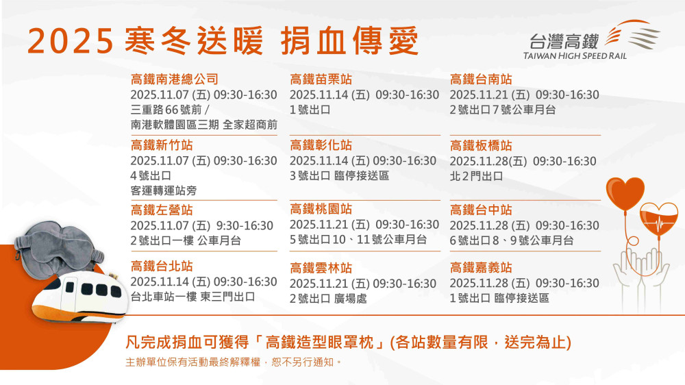 為幫助各醫療院所度過每年歲末用血需求的高峰期,台灣高鐵公司持續推動「寒冬送暖.捐血傳愛」公益活動,今(2025)年規劃自11月7日(五)起連續4個星期五,分別於高鐵南港總公司及沿線11個高鐵車站,舉辦12場巡迴募血活動;其中,高鐵新竹站將於11月7日在4號出口的客運轉運站旁舉行捐血公益活動。歡迎大家發揮愛心、共襄盛舉!