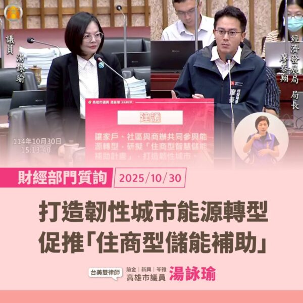 湯詠瑜說,面對2050淨零排放挑戰,儲能不僅能平衡尖峰電力,更是防災與能源安全的重要基礎,相對其他直轄市,高雄忽略對家戶、社區與商辦等中小用電戶的參與角色,她呼籲應儘速研擬「住商型智慧儲能補助」。