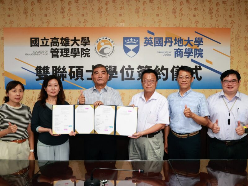 【News586/記者張淑慧報導】國立高雄大學管理學院30日宣布,與英國丹地大學(University of Dundee)商學院正式簽署雙碩士雙聯學位合作協議。自本學年起,管理學院碩士生可依合作方案採「1+1」或「1.5+0.5」模式,在兩年內完成雙方課程與審查,分別獲得高雄大學管理學院與丹地大學商學院碩士學位,建構具國際視野與實作能力的跨國學習途徑。