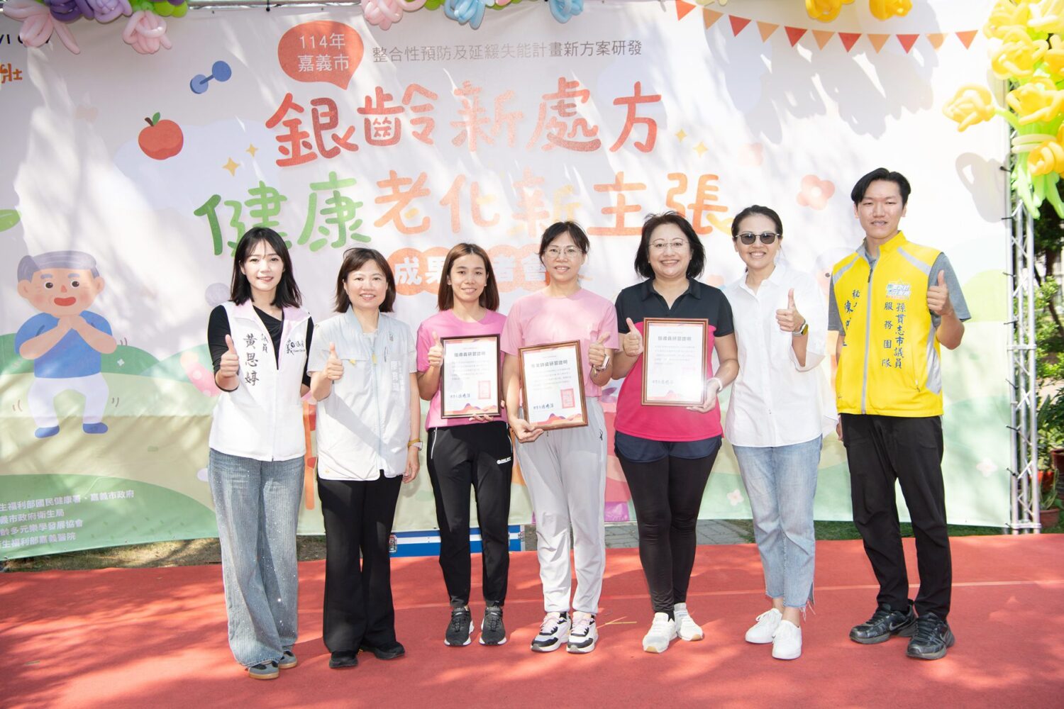 為促進健康老化與優質生活,嘉義市積極導入以行為改變為導向的健康促進計畫,鼓勵長者實踐健康行動、活出快樂人生。嘉義市政府衛生局114年委託全齡多元樂學發展協會並攜手衛生福利部嘉義醫院共同研發「114年健康老化人生社會處方箋模組方案」,於今(31)日在樂齡訓練場正式舉行結訓活動。嘉義市政府衛生局局長廖育瑋、衛生福利部嘉義醫院院長莊仁賓及全齡多元樂學發展協會理事長陳秀萍共同見證健康老化課程的成果。