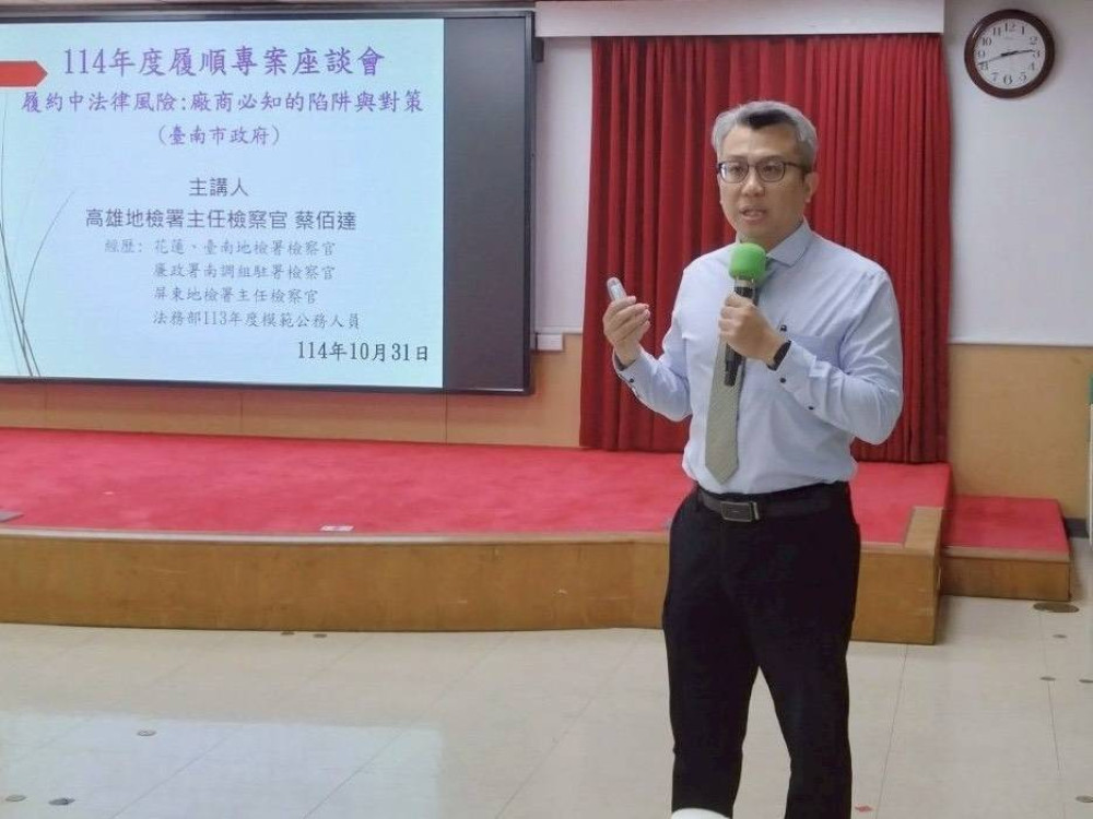 本次座談會以三大主題展開:「AI看見的風險:從缺失到改進的履約關鍵」由政風處李科長分享利用AI協助發現潛在異常及強化採購稽核效益之經驗、「勞務採購常見錯誤態樣」係由秘書處郎科長分享採購稽核常見缺失案例,提醒廠商注意履約文件缺失,建立正確履約觀念,以確保品質;最後邀請臺灣高雄地方法院蔡佰達主任檢察官分享「履約中的法律風險:廠商必知的陷阱與對策」,透過司法案例說明履約過程中常涉之法律風險,如施工內容填載不實、照片複使用等,提醒廠商切勿因一時大意而誤觸法網。