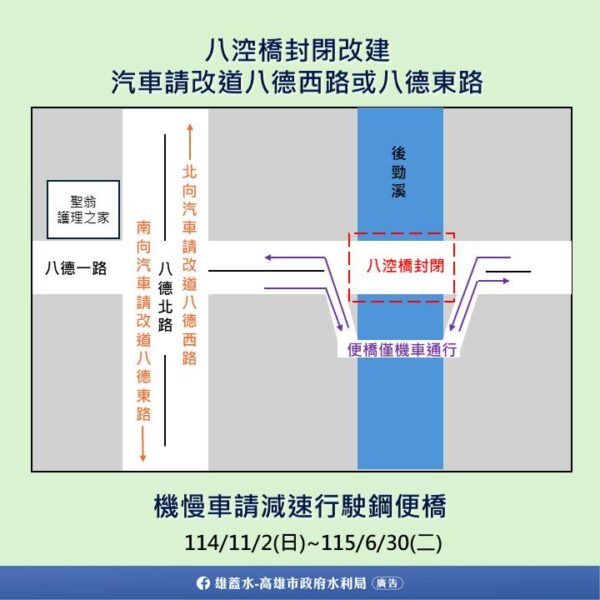【今傳媒/記者李祖東報導】配合八涳橋橋梁改建,預計114年11月2日起封閉仁武區八德一路八涳橋段,為減少交通衝擊,水利局表示,八涳橋施工期間,一般車輛來往,鳳仁路往八涳橋方向可改行澄觀路及水管路;八德北路往八涳橋方向可改行八德西路及八德東路。此外,為方便機車騎士及行人,於工區附近再設一處臨時性機車及人行便橋供使用。市府於工區範圍路段已設置交通維持設施,並已透過媒體及路口看板宣導市民改道路線,也請用路人及早因應,避開易壅塞路段。