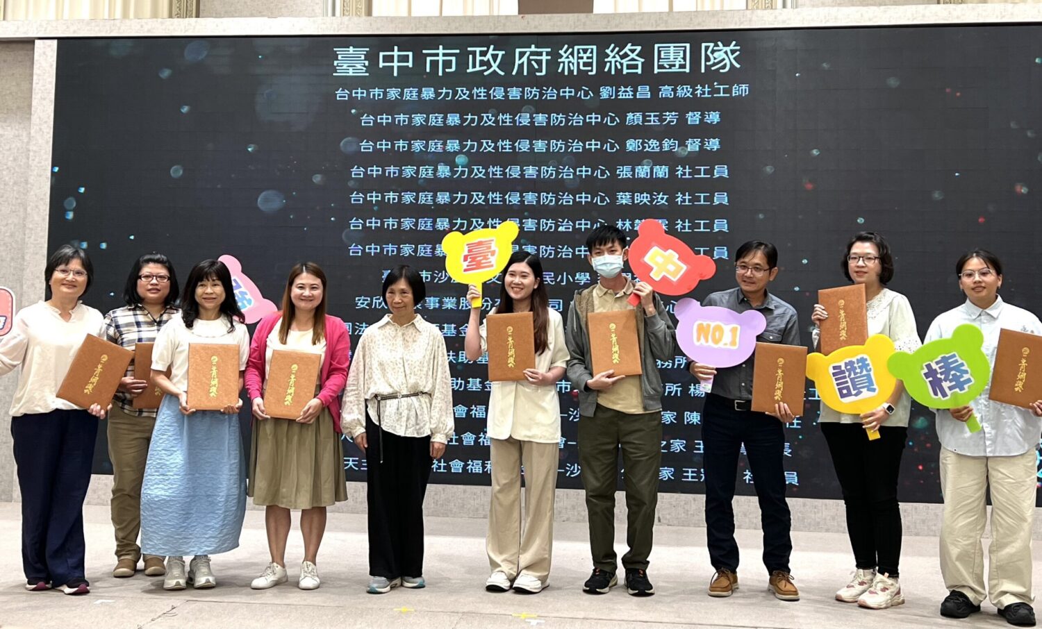 社團法人台灣防暴聯盟今(31)日舉辦第13屆「保護服務網絡之承諾與行動-菁網獎」頒獎典禮,台中市家庭暴力及性侵害防治中心展現網絡合作,榮獲2個優選及1個佳作,連續兩年獲得最多獎項。社會局主任秘書侯淑茹率隊北上領獎,感謝評審肯定台中市防暴團隊努力網住個案人身安全,一個都不漏接。
