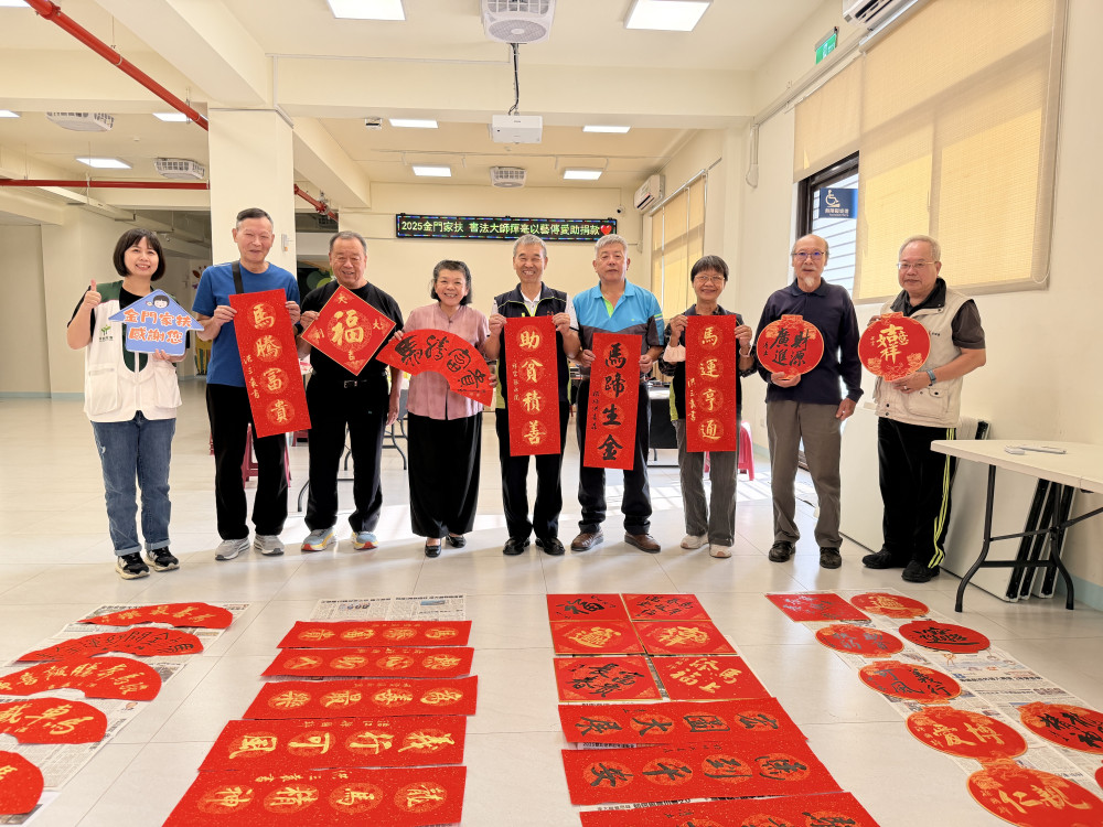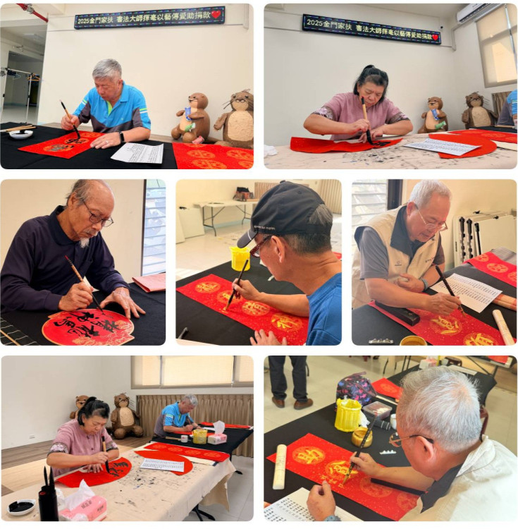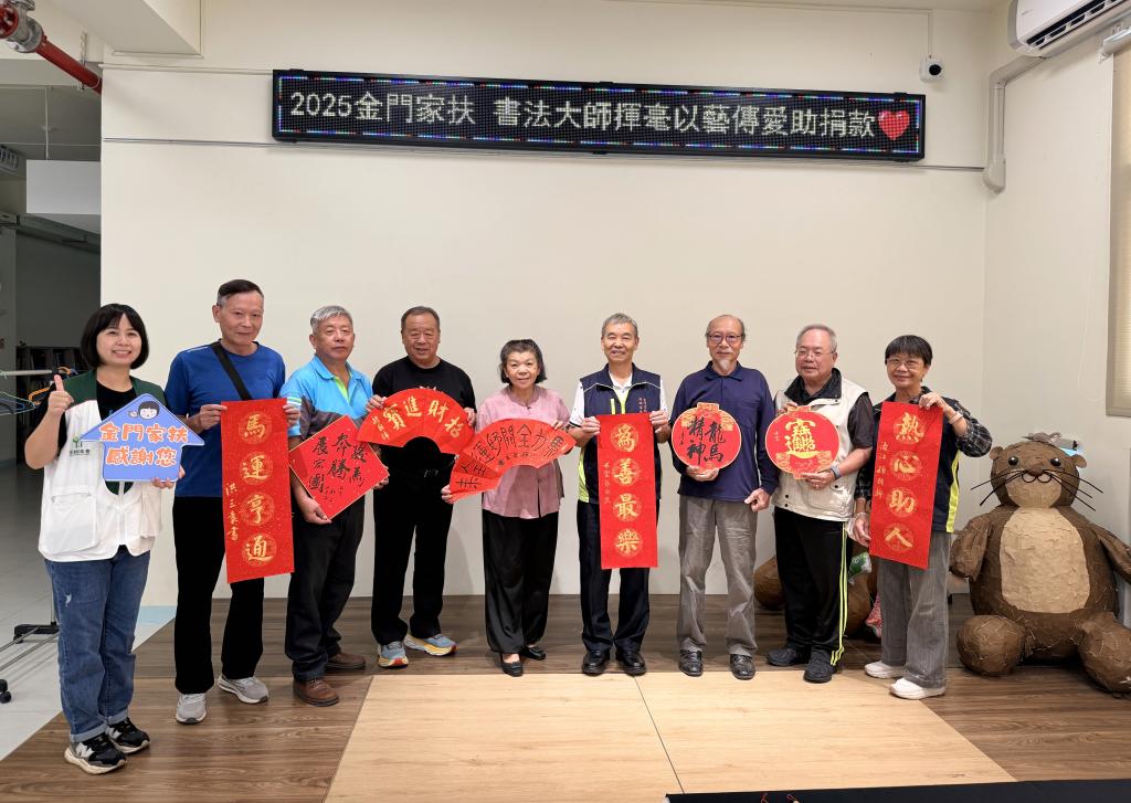 本次透過金門縣文藝協會張君玉,邀約地方書法家孫國粹、張水團、洪壽森、翁清土、洪三袁書法大師,在家扶中心一樓大廳,現場揮毫100份作品,提供給贊助園遊會扶幼助學經費民眾,舉凡贊助1萬元即可自行挑選大師們愛心墨寶1幅留作典藏,讓藝術與公益結合,共同為弱勢家庭孩子打造更溫暖成長力量。