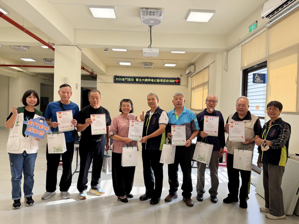 金門家扶中心主任洪依帆感謝6位地方書法家撥空到金門家扶揮毫,由楊肅謙主委代表金門家扶致贈感謝狀給書法大師,期待藉由此次捐款贈墨寶愛心活動,能夠與鄉親攜手共同關注金門地區弱勢兒童需求及學習發展,歡迎民眾11月30日一起參與愛心園遊會。