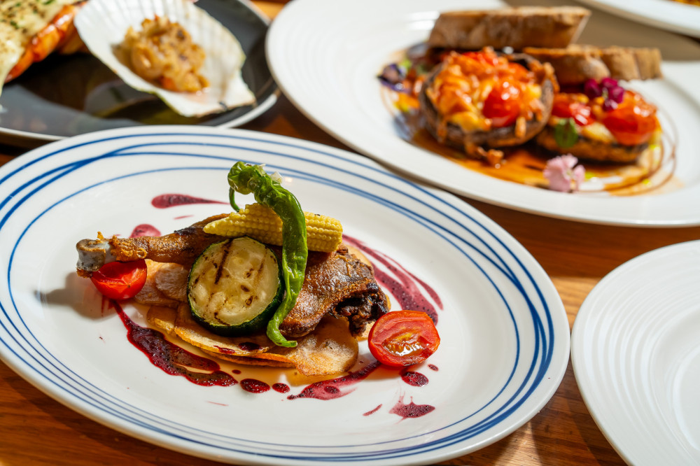 「微型派對」10 人起訂,半自助式每位 680+10% 元起(平日午餐),滿 10 位贈 1 位;11 月 10 日起新增多款主餐,含法式油封鴨腿、碳烤美國牛板腱等,另有穆斯林 HALA 認證的白松露野菇菠菜鳥巢麵(全素)及羊肚菌南瓜麥仁燉飯(蛋奶素),兼顾多元飲食需求。