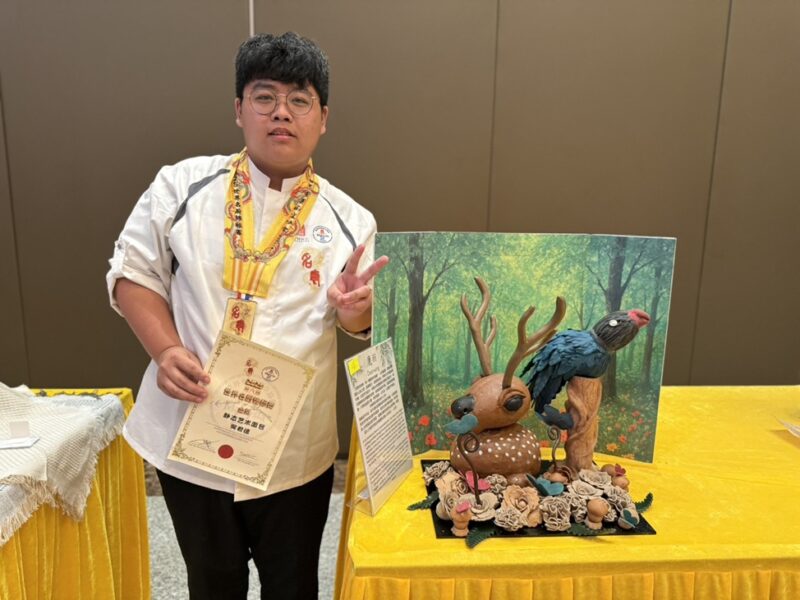 同場參賽學生 吳君德亦參加藝術麵包項目,以《台灣的梅花鹿與藍鵲》為創作主題,結合自然生態與人文意象,呈現台灣特有物種的靈動與優雅。作品以烘焙技術詮釋對土地的熱愛與文化延續,榮獲金牌獎肯定。
