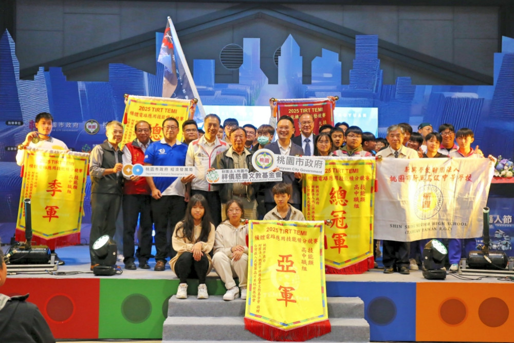 ▲2025桃園國際新創機器人節圓滿謝幕。桃園市副市長蘇俊賓(第2排中)、祥儀慈善文教基金會董事長蔡逢春(第2排左6)親臨閉幕式頒獎。(圖/中衛發展中心提供)