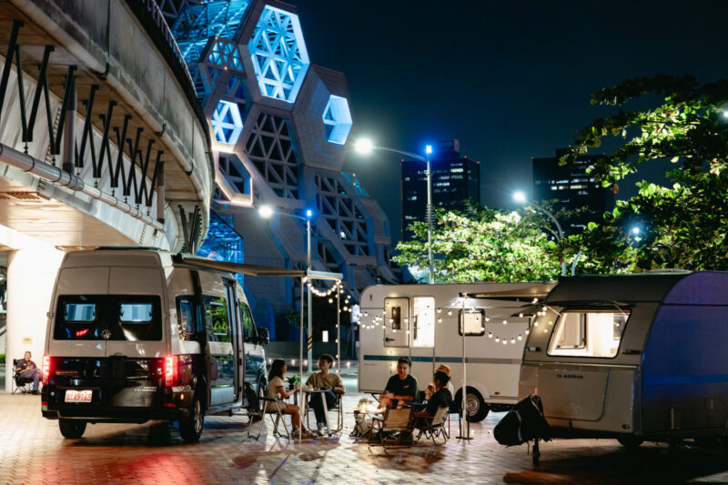 期間限定的露營活動讓大義公園變身戶外風格十足的露營區,集結8家露營品牌與5輛特色露營車,讓民眾探索戶外生活的各種提案,一覽各式露營用品與配件,同時安排多組樂團和劇團接力演出,豐富露營時光。若想活動筋骨,現場設有走繩運動體驗區;若想釋放壓力,可報名「瑜悅運動」的夜間舒緩瑜伽課,與頌缽、泰北敲筋、藥草球按摩等療癒體驗。此外,也推出露營技巧、自然手作及親子互動等主題課程,讓親朋好友共享戶外時光。
