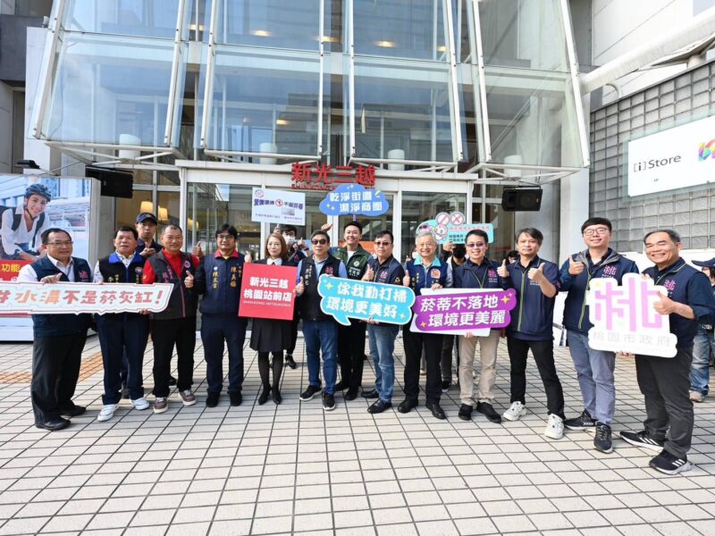 【News586/記者彭慧婉報導】桃園市環保局為營造整潔舒適的城市門戶,今(5)日上午在桃園新光三越站前店廣場舉辦「桃園火車站商圈淨街暨菸蒂不落地宣誓活動」,號召桃園火車站、衛生局、警察局、區公所、商圈店家、計程車業者、宮廟及環保志工隊等超過200人共同參與,以實際行動展現打造無菸蒂環境的決心。