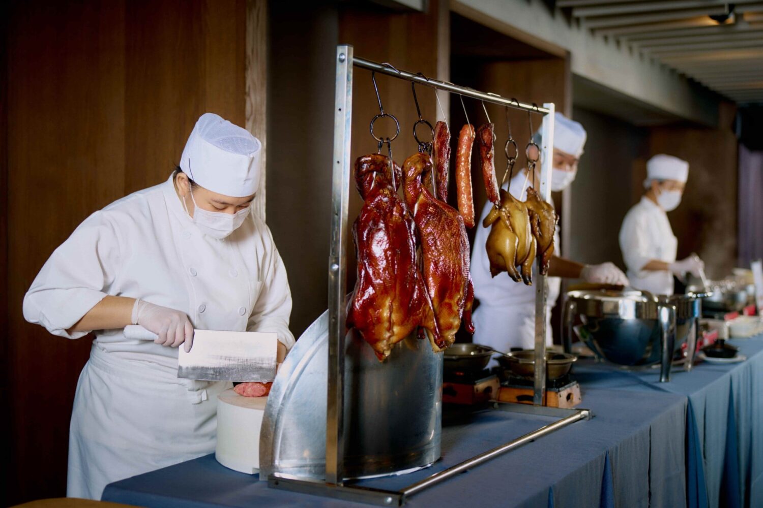 ▲台南晶英「府城茶樓」提供經典燒臘現切蜜汁叉燒、玫瑰油雞、廣式燒鴨與香腸等肉品。(圖/台南晶英提供)