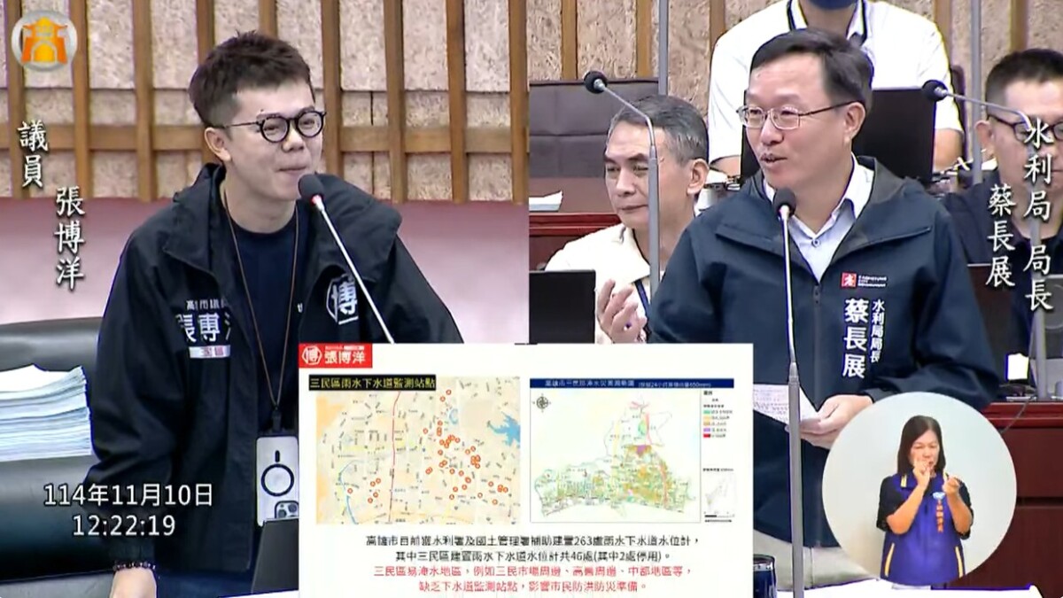 張博洋質詢時要求水利局應提升雨水下水道監測設施的功能。(記者翻攝)