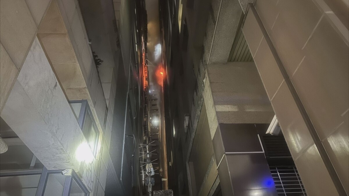消防局從對向大樓噴水灌熄起火點,火勢迅速被撲滅,上百名住戶緊急疏散,所幸無人傷亡。(圖:記者李佳龍/翻攝)