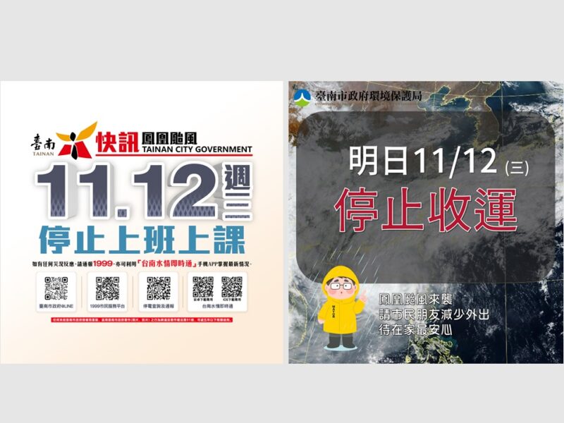 臺南市政府宣布 明(11/12)日停止上班、停止上課