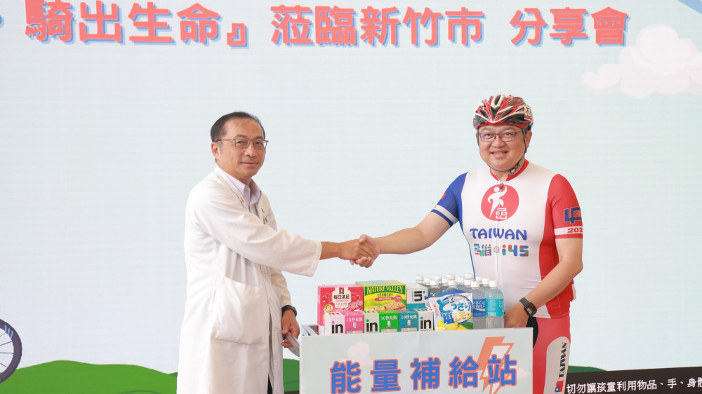 ▲「不倒騎士.騎出生命」癌友單車環台圓夢活動,11/11日抵達新竹馬偕紀念醫院,院長翁順隆(左)贈送能量補給品給不倒騎士,為他們補充體力,台灣抗癌協會理事長黃文傑(右)代表受贈。(圖/新竹馬偕提供)