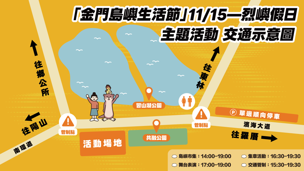 金門縣府說明,因應活動期間可能湧現之人潮與車潮,將於活動周邊道路實施交通疏導與管制措施,以維持行車順暢及人車安全,呼籲前往參與活動民眾及行經該路段之駕駛人配合員警指揮,共同維護交通秩序。
