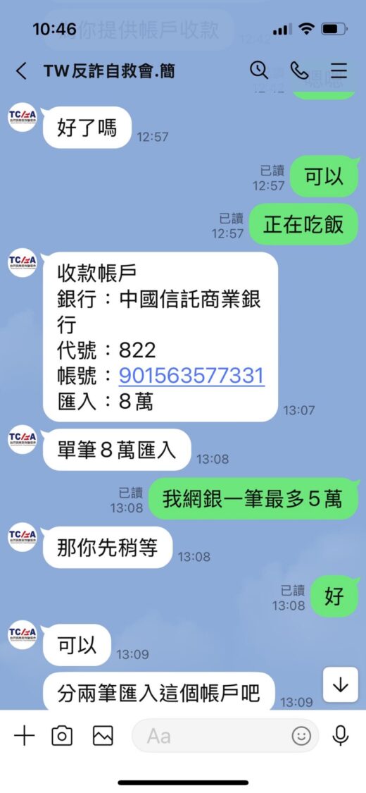 一名民眾表示,自己先前因網路投資詐騙損失近百萬元,誤信該名冒充協會人員的詐騙集團成員能協助追回金錢,依其指示先匯出所謂的「前期技術費用」新台幣八萬元,並簽署「資金追回委託書」。詐騙成員後續回覆「款項已追回」,卻又以「帳號問題」為由無法入帳,該民眾驚覺異常,遂報警並向協會查證,確認自己再度受騙。