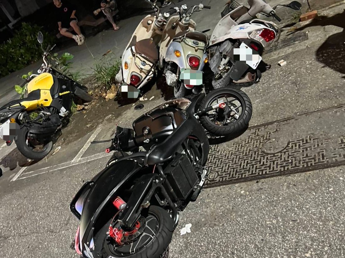 年輕人拒絕接受攔查而逃逸,並於左轉安海街時因不明原因擦撞路旁停車自小客車,再擦撞普重機3輛,現場無人受傷。(記者翻攝)