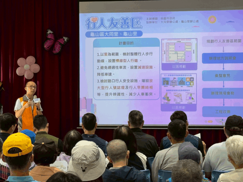 交通局長張新福表示,過去較常針對單一路口或是路段改善,行人友善區為以區域作為整體規劃並由市府跨單位合作執行,自113年開始推動規劃,今年度已完工3個區域,114年再選定龍潭區龍潭里、蘆竹區南興里、龜山區大同里及龜山里作為行人友善區規劃場域,已於11月完成前述4處行人友善區說明會,將針對交流意見調整規劃方案,預計115年進行工程改善及公告行人友善區範圍。
