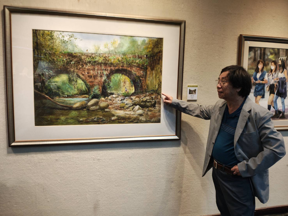 洪啓元指出,郭總裁畫山海林木,建築题材, 利用水與彩多次暈染、濁中透清暗中帶亮氣韻生動;他的風景畫看似隨性順手拈來揮灑,實則是對水和顏料行走軌跡自由豪放安排,他的濕潤讓水與色交融,塑造氛圍與意境。