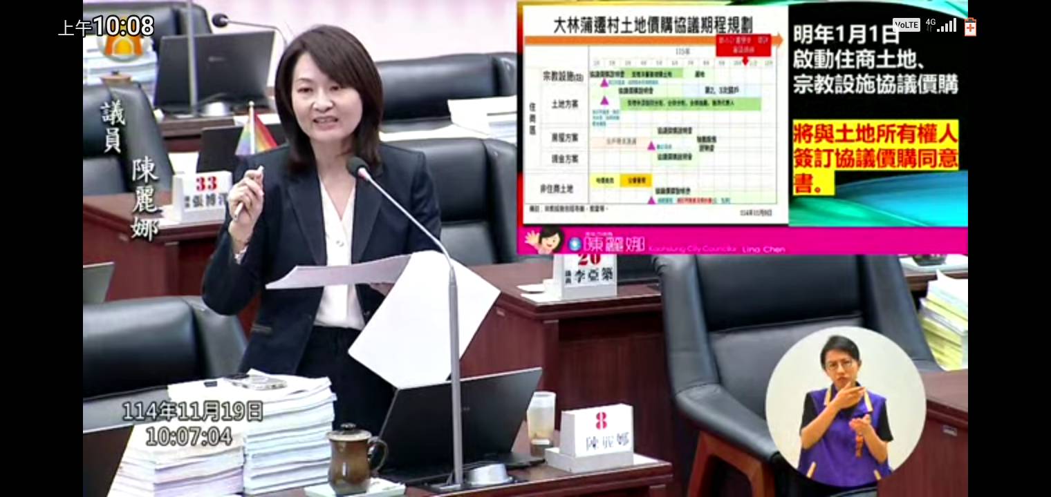 陳麗娜議員總質詢追蹤大林蒲遷村進度,她指出,明年1月1日將啟動土地協議價購,但住商用地、宗教設施價格與「畸零地主增購方案」仍不明朗,尤其遷村方案「以地為主」造成共有土地持分如何歸戶、能否單獨分配等問題,她要求增購價格應以向台糖承購成本價計算,並由市府專案協助畸零地集中分配與協力造屋。