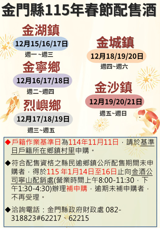 【大成報記者于郁金/金門報導】115年春節配售酒各村里售領現場作業將自114年12月15日(一)陸續展開,依次為金湖鎮12月15日(一)至17日(三)、金寧鄉12月16日(二)至18日(四)、烈嶼鄉12月17日(三)至19日(五)、金城鎮12月18日(四)至20日(六)及金沙鎮12月19日(五)至21日(日),縣府財政處提醒鄉親如果於115年2月17日(含)已設籍本縣連續滿4年,並已年滿18歲,取得一般配售資格,請於各鄉鎮配售期間向各村里配售點洽購,申購後之提貨單請於提領期限115年2月26日前(營業時間上午8:00-11:30,下午13:30-16:30)至金酒公司寧山庫提領酒品。