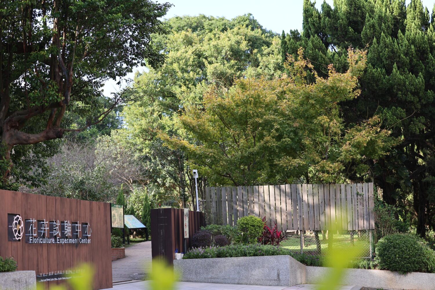 花卉試驗中心園內栽植有黃金槭通稱黃金楓,雖然不像滿山楓林般壯闊,但位在步道旁的黃金楓,呈現靜謐而詩意的風景,深受遊客喜愛。生態池畔的銀杏同樣是園區亮點。銀杏屬落葉闊葉喬木,其扇形葉片在種子植物中相當獨特,具有一般裸子植物少見的闊葉形態。每到秋季,葉片逐漸轉為金黃色,是攝影者取景的焦點。
