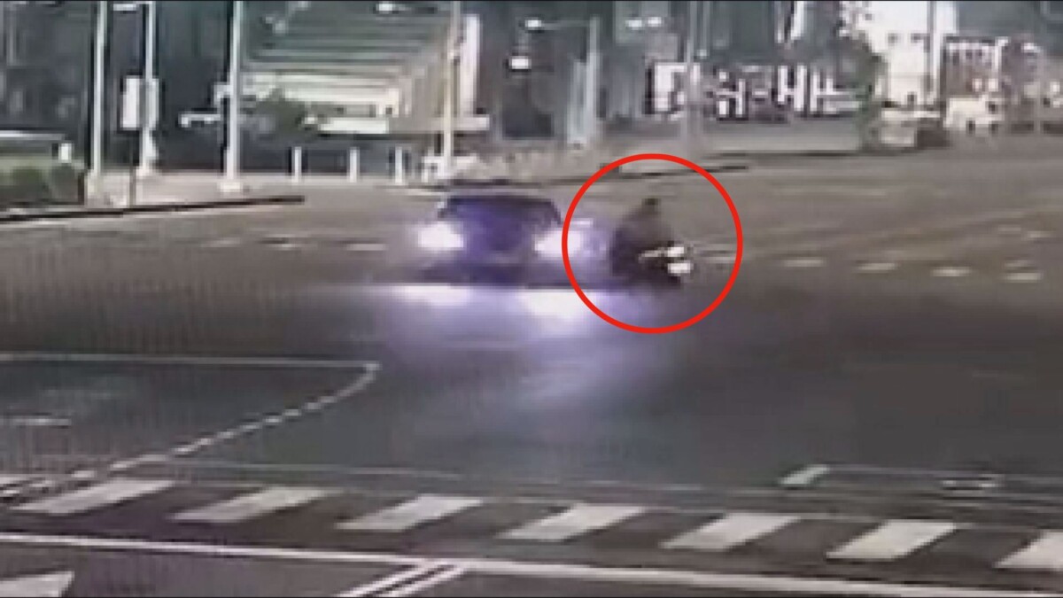 高雄市苓雅區三多、中山路口20日凌晨發生一起機車騎士逆向蛇行衝撞巡邏警車事件,騎士撞擊後加速逃逸。(圖:記者李佳龍/翻攝)