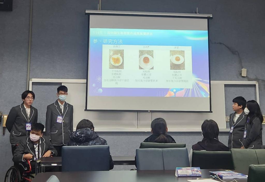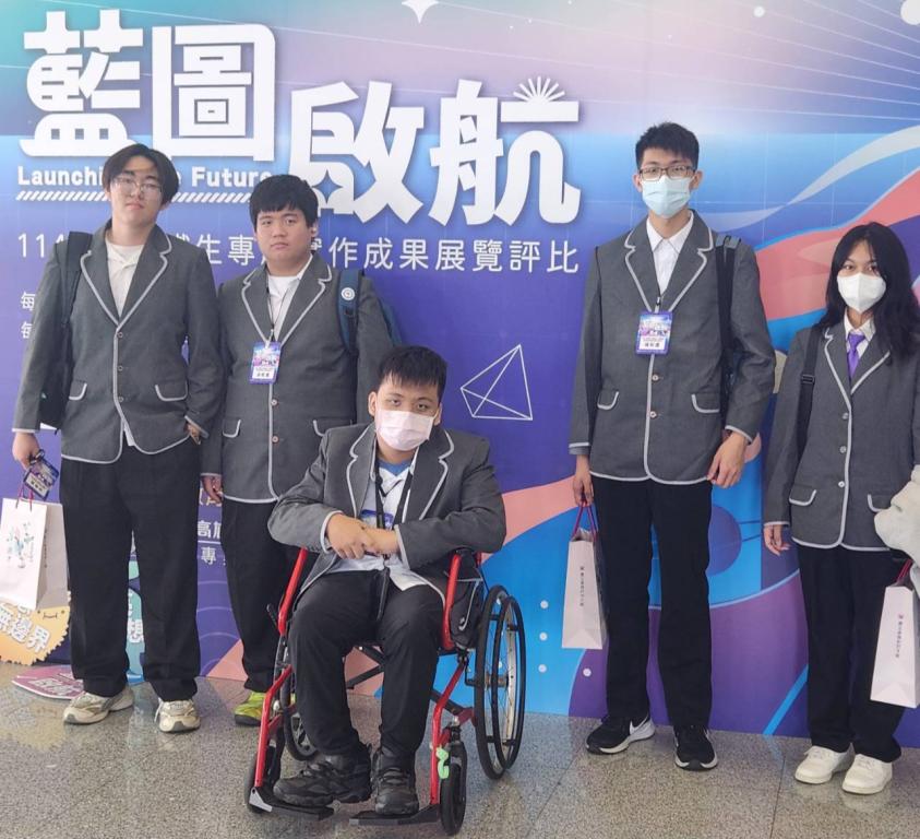 值得一提的是,本組成員之一、來自餐飲科鄭順謙同學,身為多重障礙學生,因手部萎縮、無法行走,全程需以輪椅代步;然而他並未因身體限制退縮,反而主動投入資料整理、研究分析、專題撰寫等任務,以毅力與態度感動全場,為團隊爭取到更多肯定。