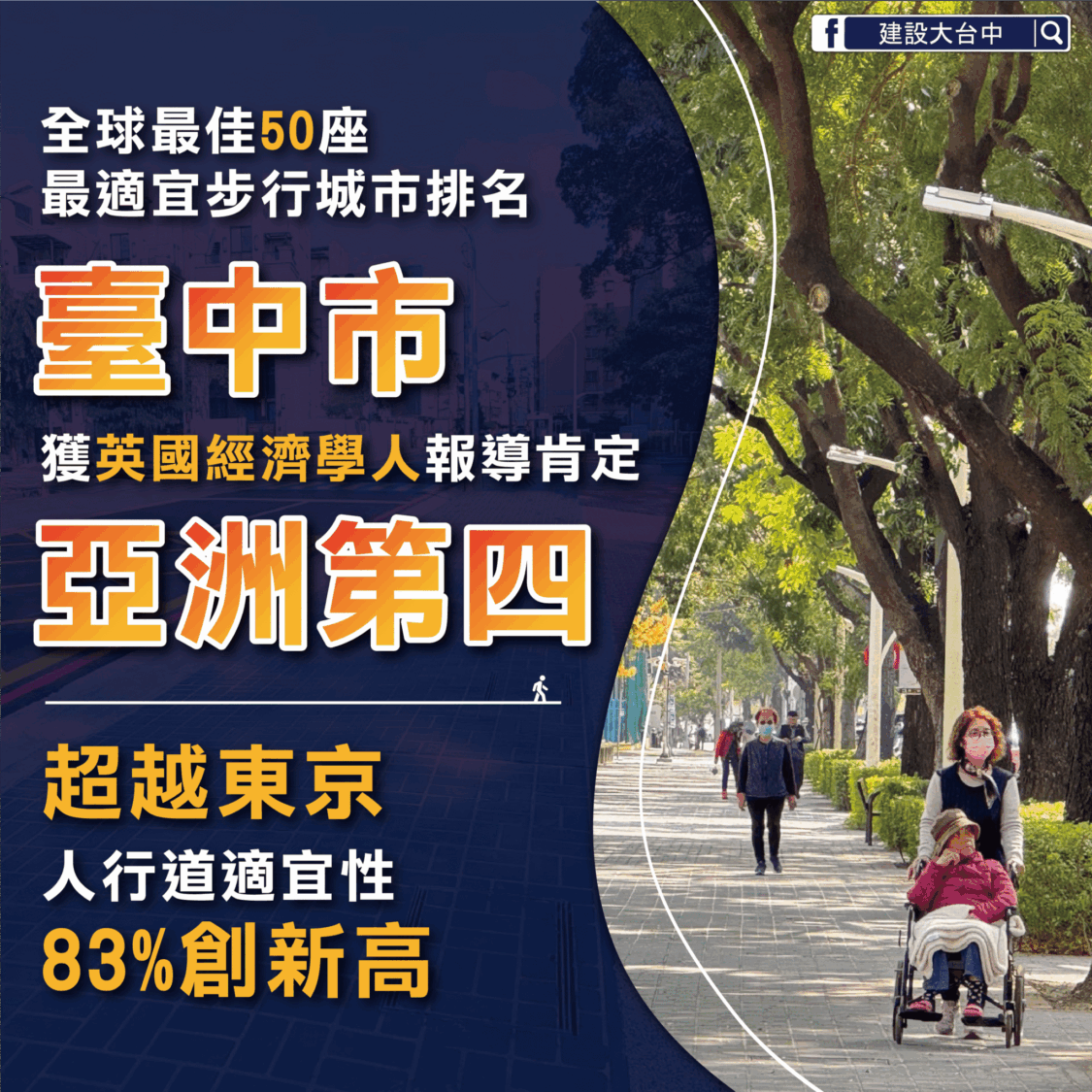 建設局表示,「台中市道路人本環境政策發展論壇」已舉辦至第二屆,今年更邀請澳洲雪梨科技大學教授Rhys Williams跨海分享國際步行城市經驗,並首度辦理學生競圖,吸引13所大專院校、共120件作品展現創意。市府也與交通局、警察局、教育局跨局處合作,從設計、硬體、宣導到執法多面向著手,讓台中市在2025年英國《經濟學人》研究中獲評為全球步行友好城市第49名、亞洲第4名,並在中央「金路獎」與道路考評中屢獲佳績,展現市府推動人本交通的卓越成果。