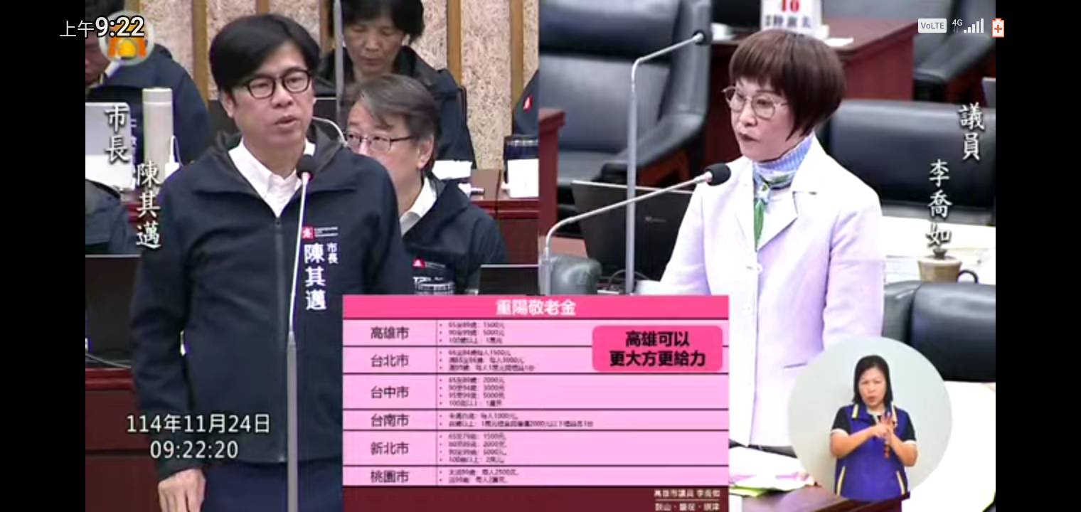 此外,李議員對重陽敬老金提出加碼主張,建議陳市長參考其它縣市對長者的敬老金數額,將65至89歲在112年從1千元加碼至1千五百元之後,再次加碼至2千元,將是陳市長兩個任期屆滿前的臨別秋波回眸一笑,高雄更大方更給力。