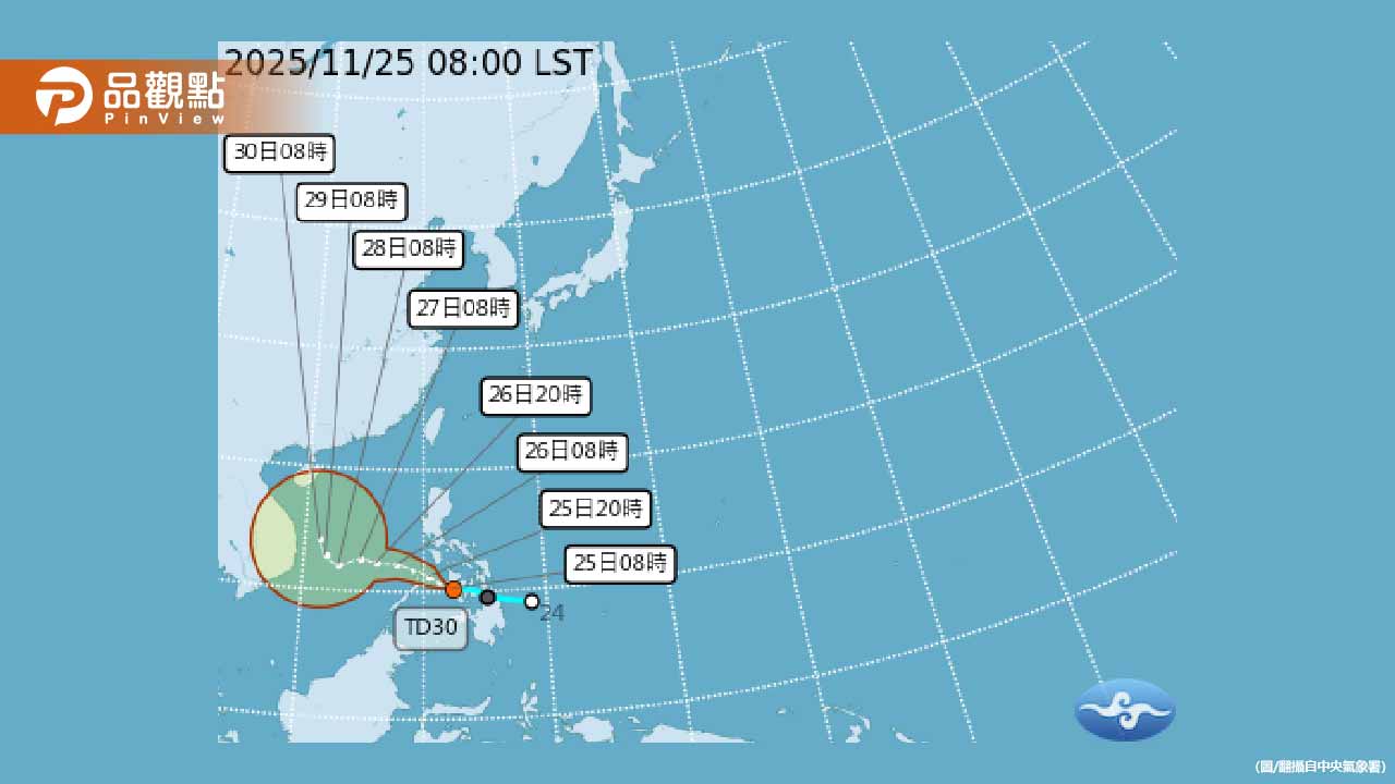 中央氣象署表示,菲律賓棉蘭老島東部近海的熱帶性低氣壓,預計將在今日內增強為今年第27號颱風「天琴」。根據最新觀測資料顯示,該系統中心位於北緯10.1度、東經124.2度,最大風力達7級,風速15米每秒。