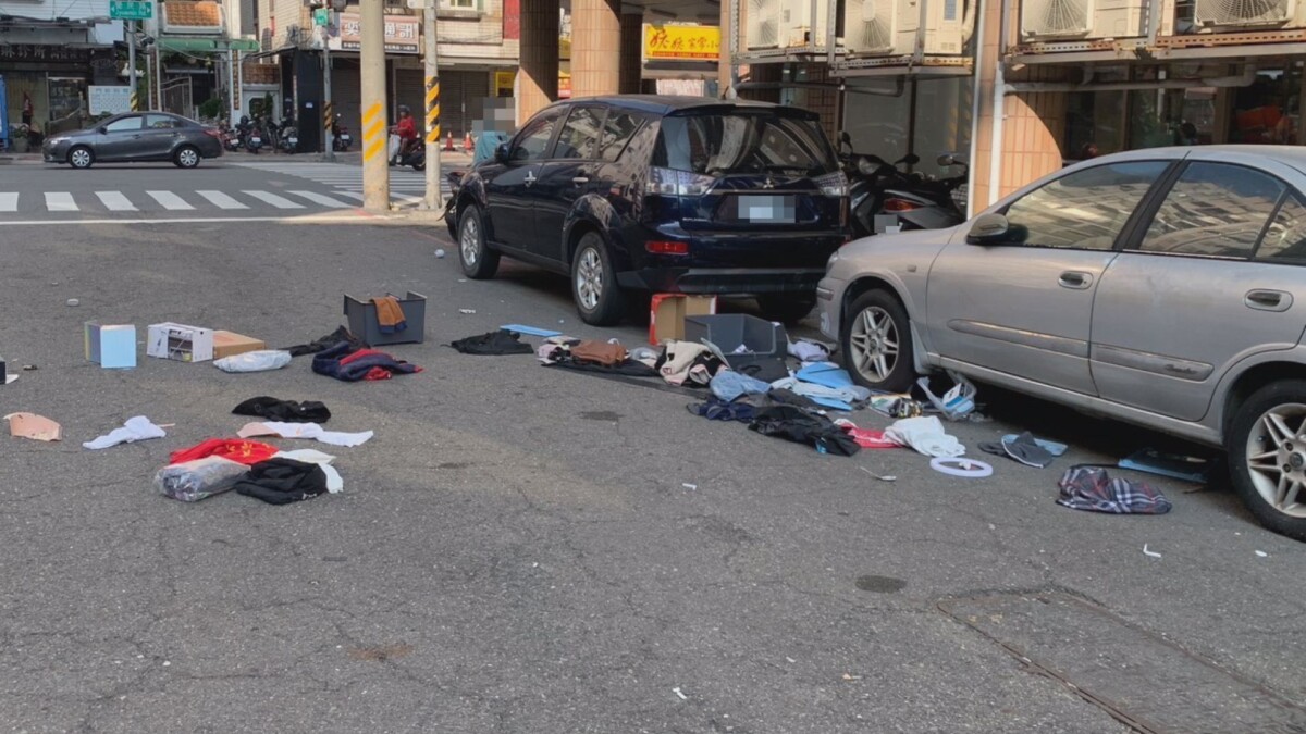 物品雜物散落一地,同時砸中路邊汽車,警方認此行為已涉及公共安全,依法偵辦。 (圖:記者李佳龍/翻攝)
