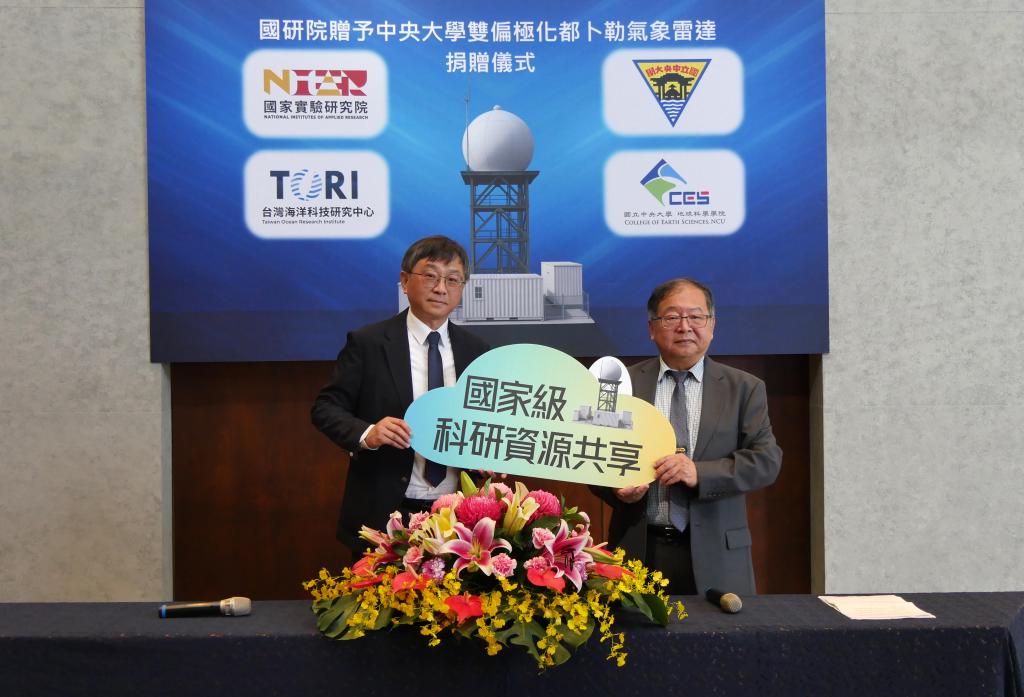 ▲國研院海洋中心主任孟培傑(右)與中央大學地球科學院院長李明旭(左)於捐贈儀式中完成雙偏極化都卜勒氣象雷達交接。(圖/國研院提供)