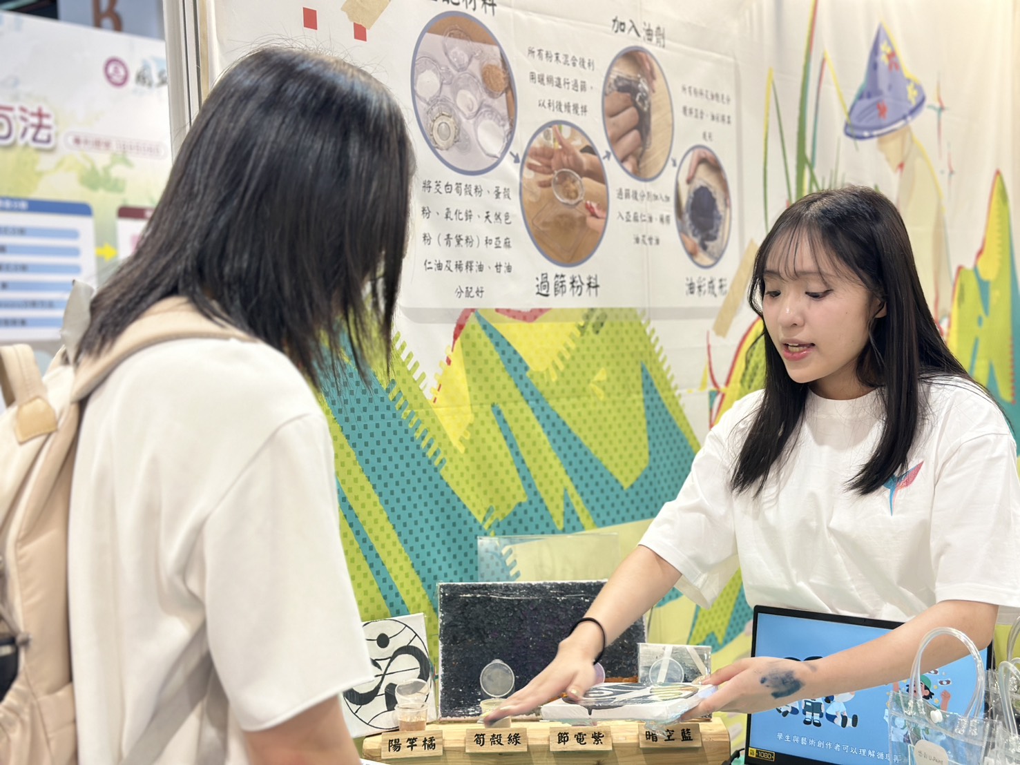暨大附中學生鄭怡心、張芷芸在駱奕帆老師與洪晧銘老師的指導下,共同研發作品「油彩顏料組合物及其製備方法」。創作靈感源自合歡山的暗黑星空,兩位學生利用原本可能被棄置的筊白筍殼、蛋白殼等材料,加入植物色粉與環保油劑,調製成主色調「暗空藍」。此色澤深邃沉靜,並富含天然顆粒質地,成功呈現夜空的層次與深度。作品並延伸開發「節電紫」、「筍殼綠」、「陽竿橘」等顏料,以描繪山影、星光與自然交融的畫面。