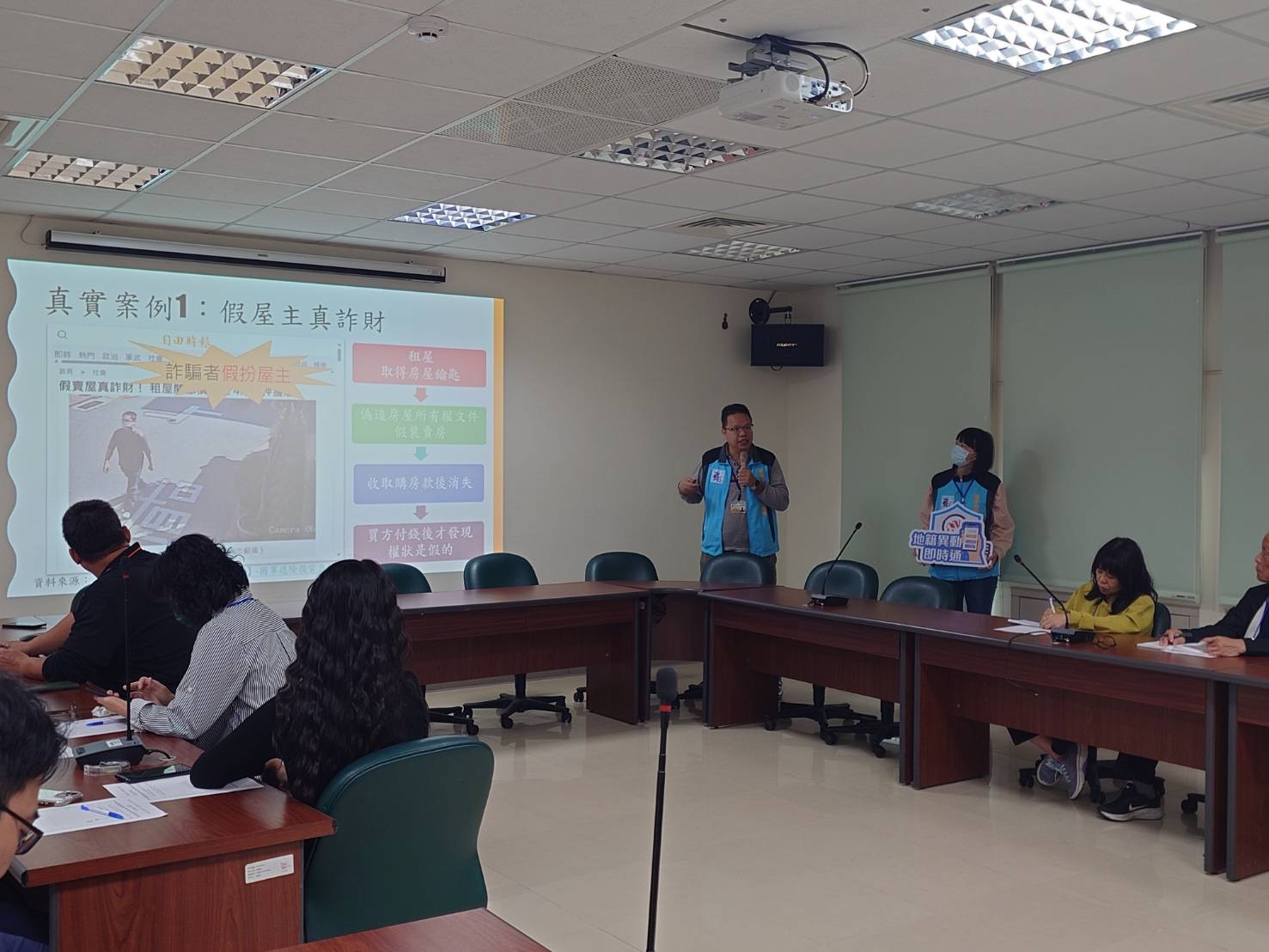 龍井地政事務所於龍井區公所里幹事工作會報中進行「防詐宣導」-向里幹事宣導詐騙類型