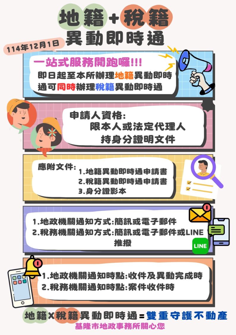 基隆市地政事務所與稅務局攜手推出貼心服務啦!為了守護市民的不動產安全,將於 114年12月1日正式啟動全新的 「地籍+稅籍異動即時通」。只要跑一趟,就能一次開啟地籍+稅籍通知雙服務,基隆人的房產防詐從此全面升級!