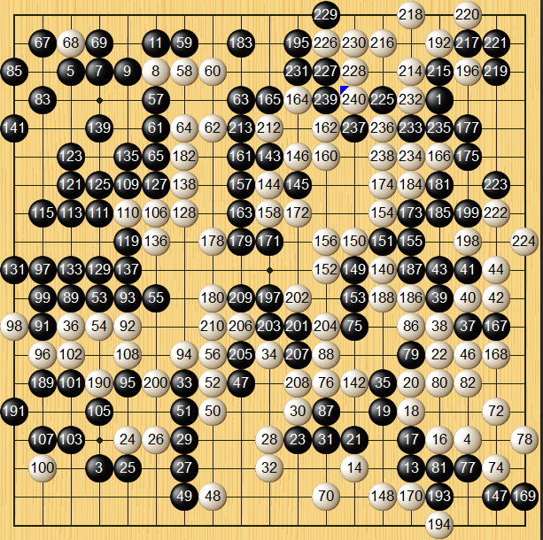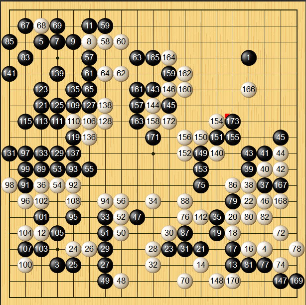 但是,白棋憑藉左邊大量棄子,圍成左邊大牆,白棋166勇敢打入右邊,營造大規模攻殺,最後白棋成功擄獲右下黑棋大龍,最後逼黑棋投降。(白棋中押勝)