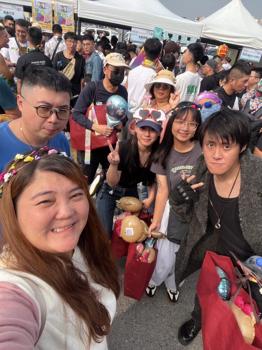 但當他們戴起彩虹眼鏡、提著氣球、與隊伍中的布偶熊合照,當沿路的民眾喊著加油、頻頻向他們比出「Love is Love」的手勢,他們的步伐開始鬆開,臉上的表情也變得明亮。