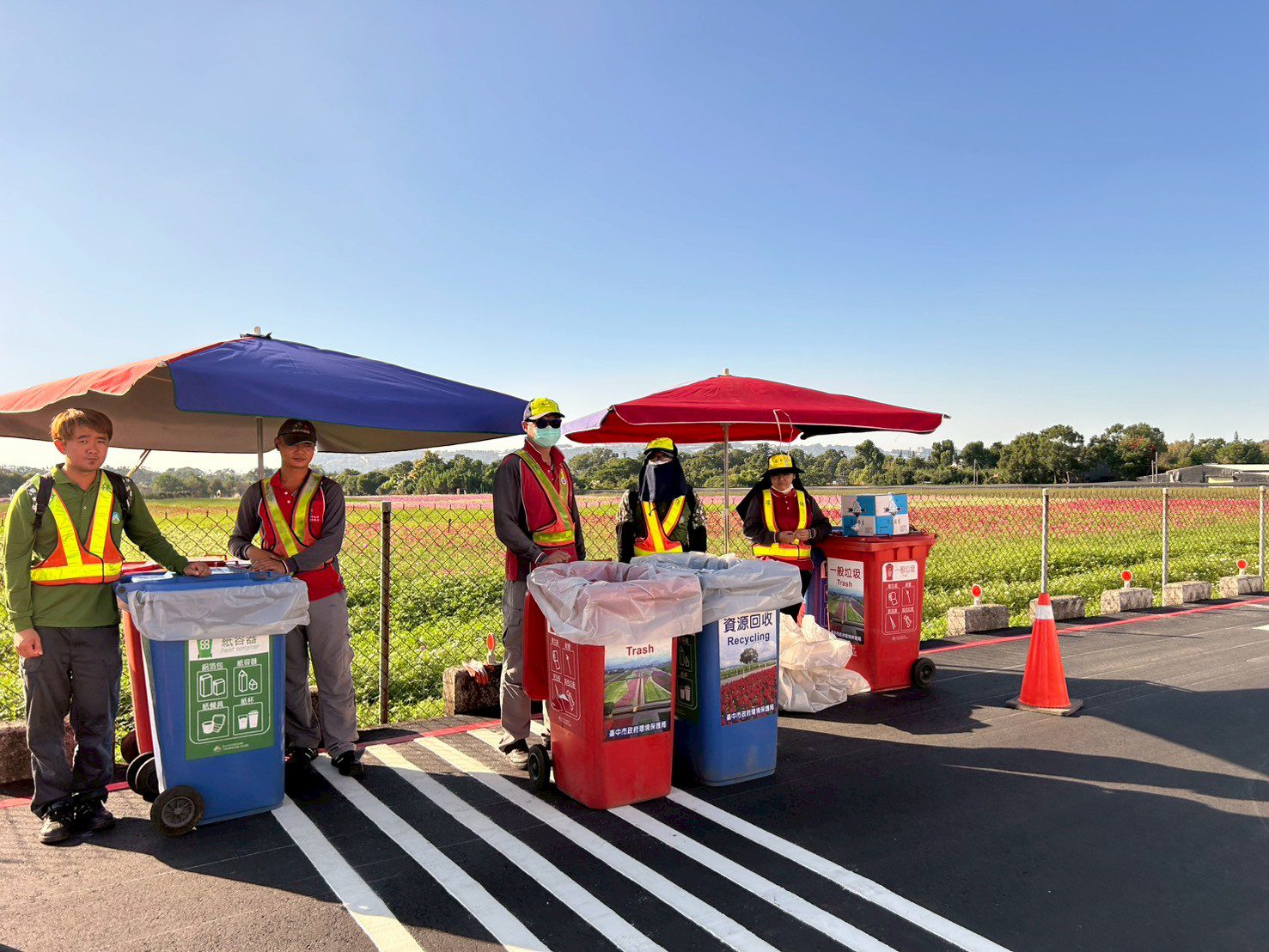 新社區清潔隊長梁敬德提到,今年特別於園區各個回收點將資源回收物回收後讓資源可以不斷地還原、再生,物命生生不息。另花海場地為農業種苗場種植育種使用,屬於未舖設硬舖面的農地,清潔隊出動灑水車協助展區週邊道路及展場接駁總站揚塵抑制及洗掃作業,減少灰塵、清潔道路。另環保局也設置流動廁所於主展區、太原停車場、東勢河濱公園,方便遊客使用,並安排駐點清潔人員加強清潔,讓賞花遊客有舒適清爽體驗。